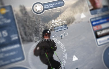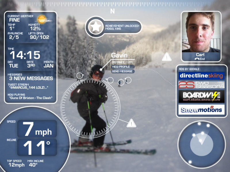 Hoping for an Iron Man style AR-HUD overlaying graphics on your field of vision I was dismayed to find that the display was actually a tiny LCD screen mounted on the inside of the goggle. I put my credit card away and took the Top Gun soundtrack out of the stereo. It seems my dreams of a night-vision enabled goggle that will allow me to board in a full white-out blizzard while listening to AC DC will have to wait. This is probably not a bad thing; when such technology does arrive it will probably look more like this visual nightmare of Geocities proportions: