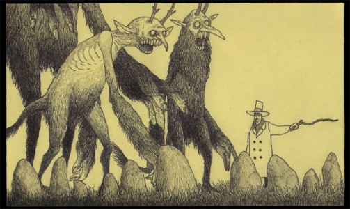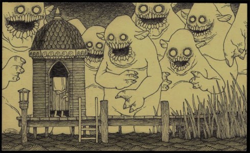 John Kenn’s other worldly illustrations remind me of Haiyo Miazaki meets Tom Gauld with a subtle nod to Cerebus-era Dave Sims. But what really appeals to me is the fact that he renders all of his handsomely intricate penwork on post-it notes, thus catering to my office stationary fetish. They remind me of a time many years ago when – working in the cloakroom* at a London art fair – I would pass the time between fetching coats by producing commissioned illustrations in biro on some abandoned printer labels. Happy days. More delightful images on John’s blog.
